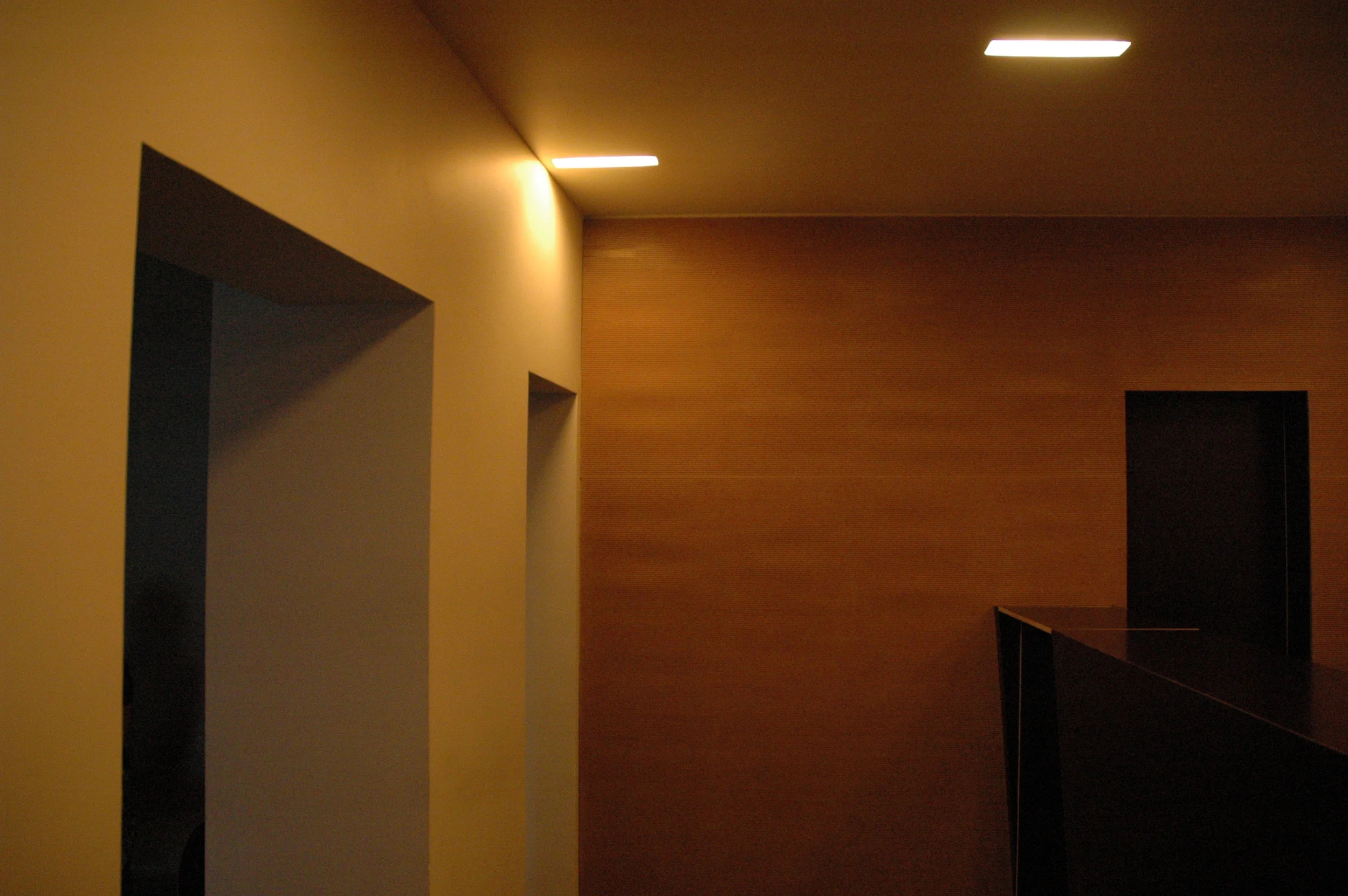 O mobiliário é desenhado e construído com o contraplacado castanho escuro que emerge da mesma côr do pavimento e estabelece um forte contraste com as paredes.