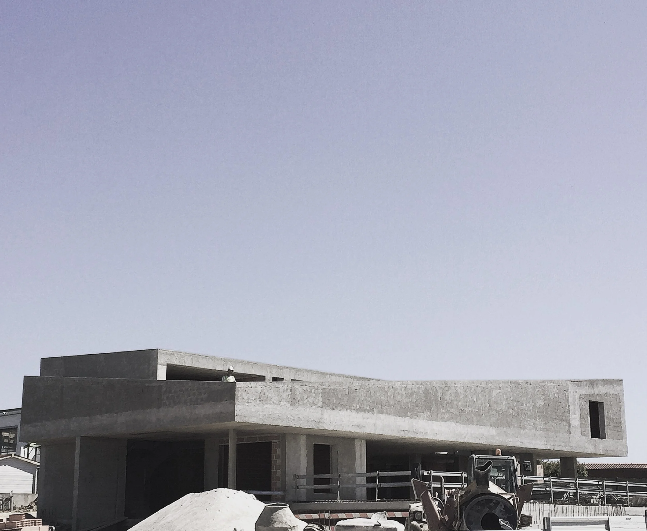 O piso enterrado é, no exterior, totalmente revestido a pedra calcária, pretendia-se que a pedra resultante da escavação fosse reutilizada na construção dos muros deste piso, criando um embasamento maciço que irá suspender todo o piso térreo, que se pretende ser todo envidraçado, permitindo estabelecer continuidade visual e funcional dos espaços sociais com os espaços exteriores como o grande terraço, a piscina e as áreas de lounge e de fogo aberto, a sul e o jardim de inverno, a norte. Esta imagem de transparência contrasta fortemente com o volume branco no piso superior que, em forma de espiral, configura um grande terraço no seu interior e protege os espaços privados da vista da envolvente, subtraindo todo o ruído visual do edificado e apontando o nosso olhar para a vista de mar, ao recortar as paredes do alçado a convergir num ponto.