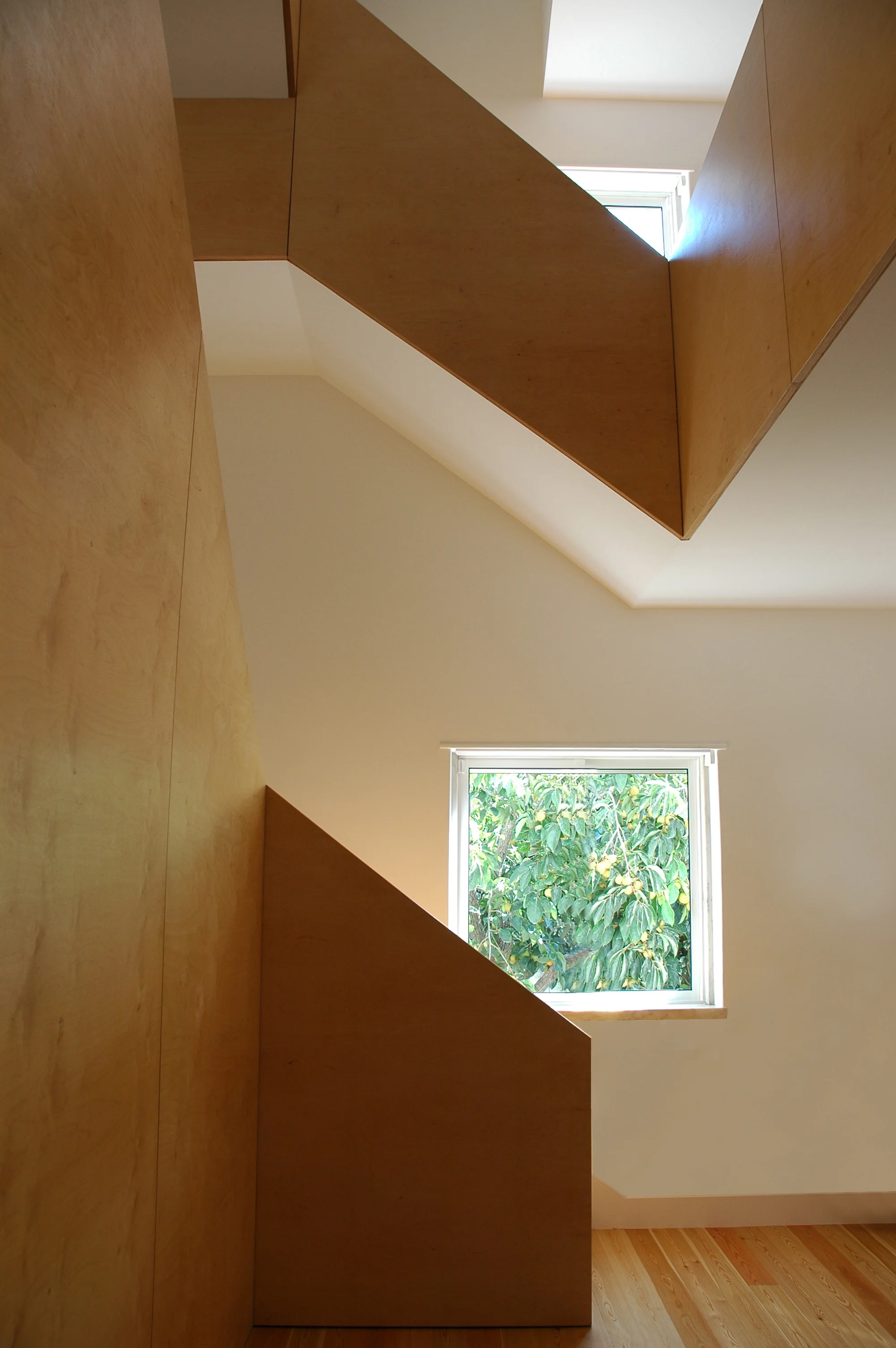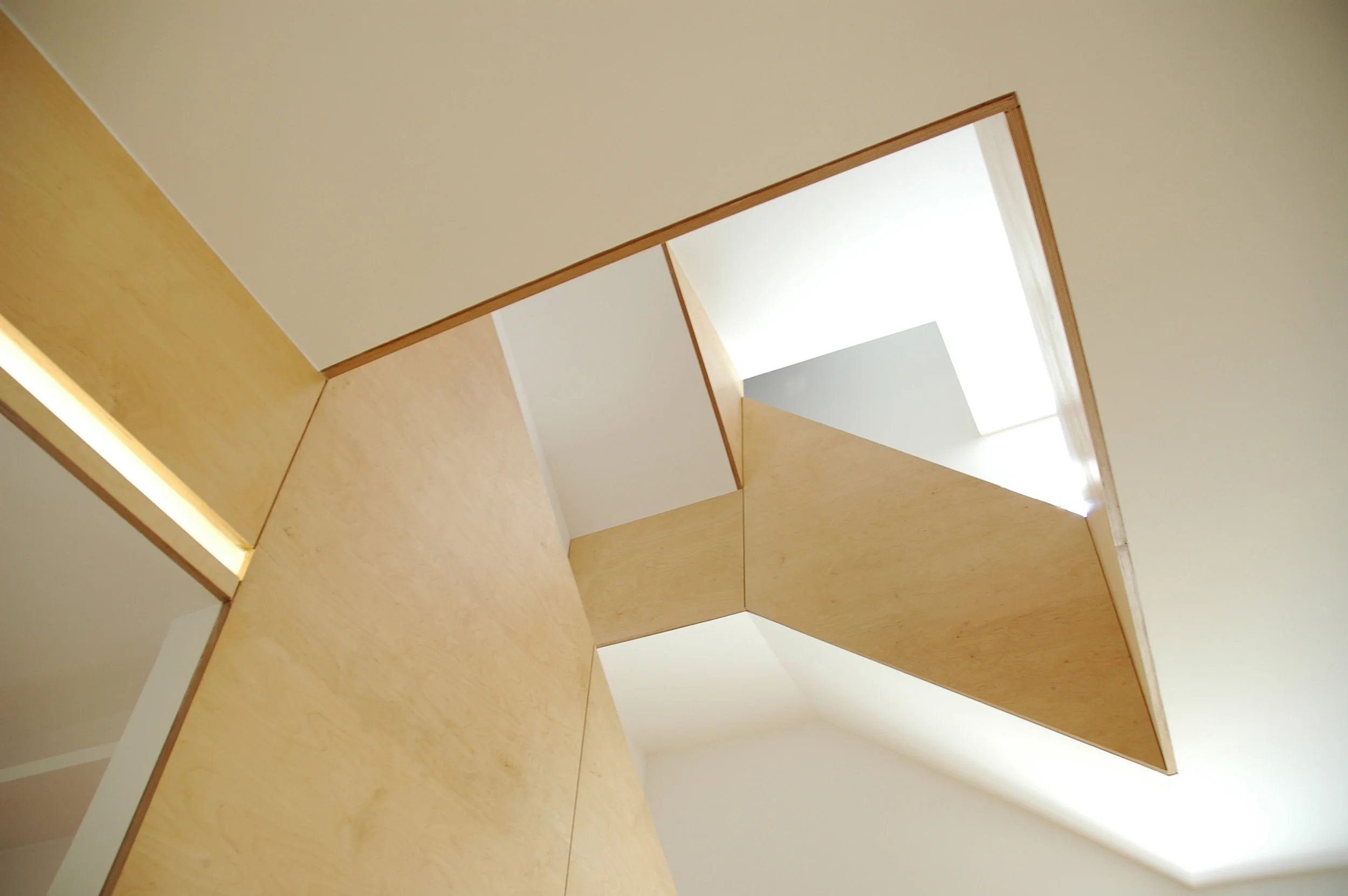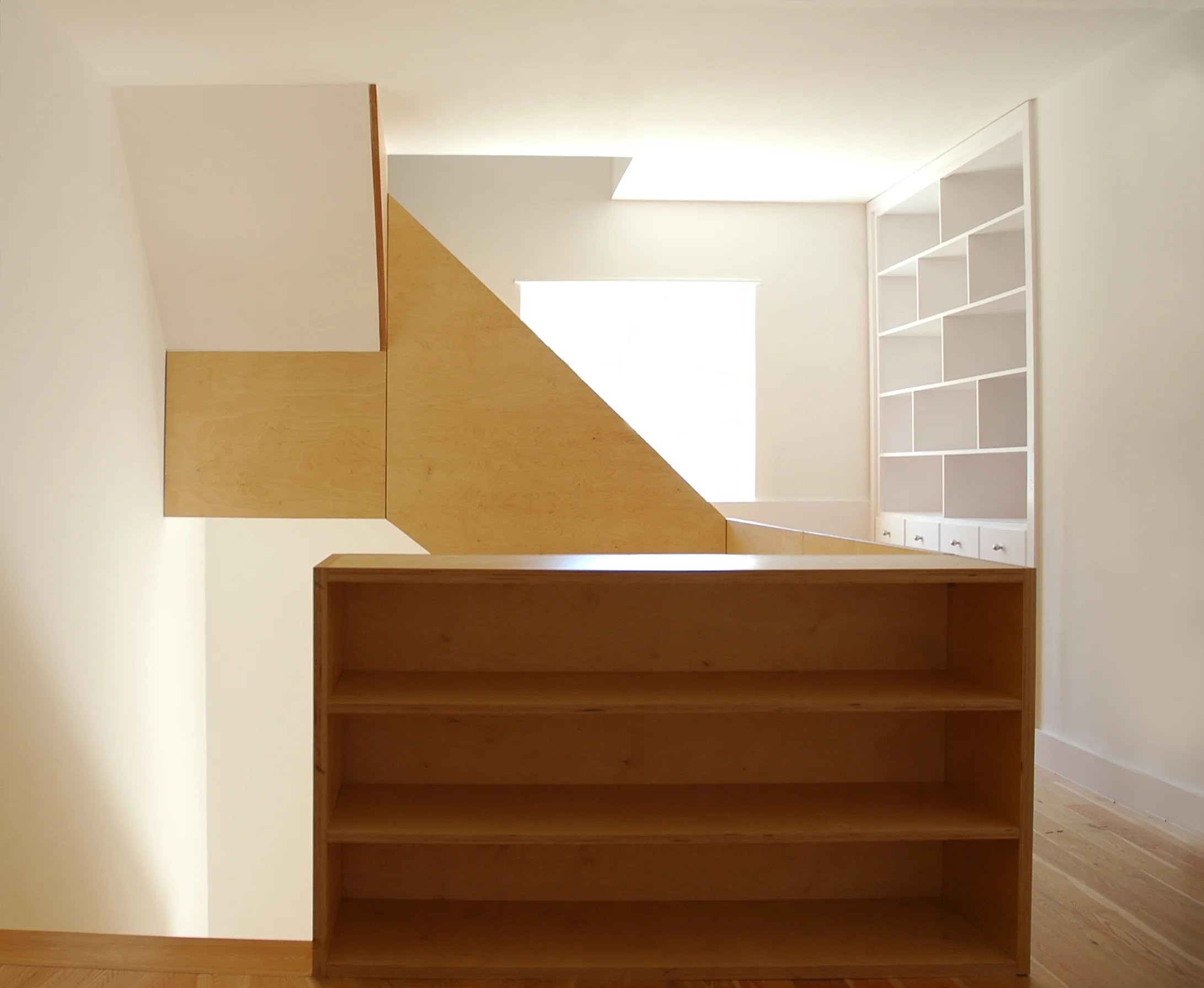 Uma moradia de 3 pisos, dos anos 1970, com áreas desajustadas nos espaços comuns e de circulação, permite uma intervenção vertical, única. Abrimos as lajes, duplicamos pés direitos e desenrolamos uma escada em torno do vazio. Revelam-se novos trajectos visuais e sociais.