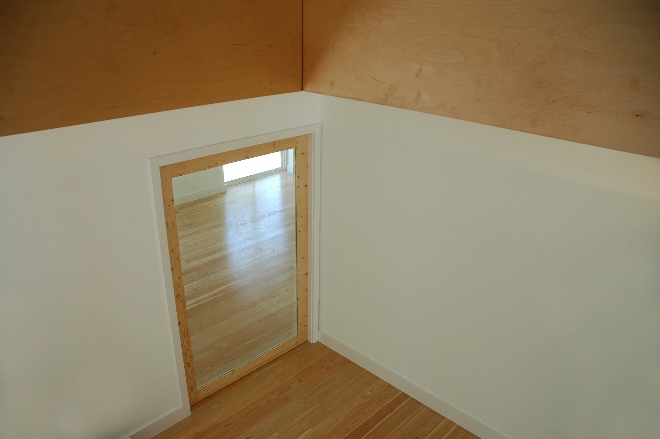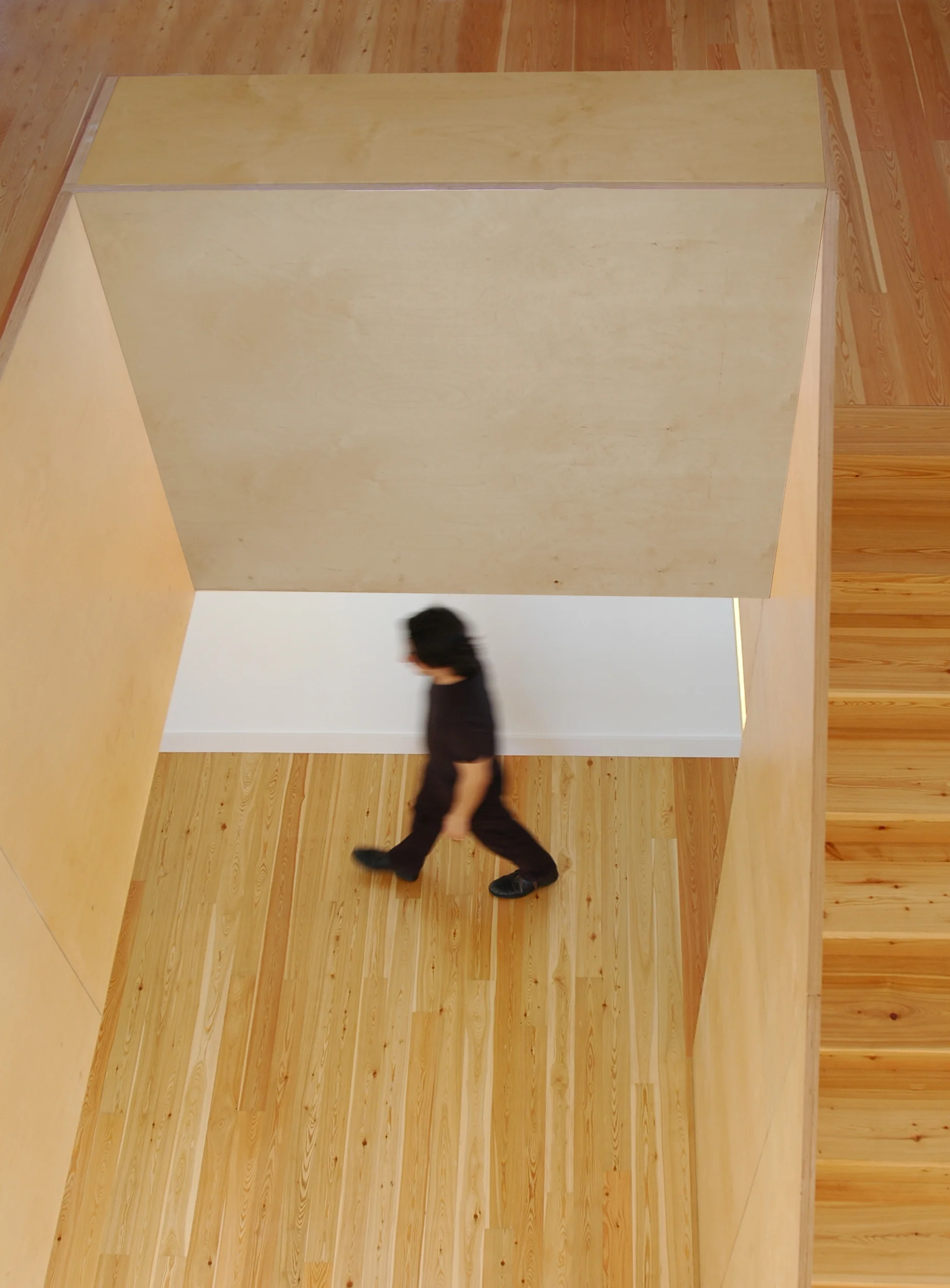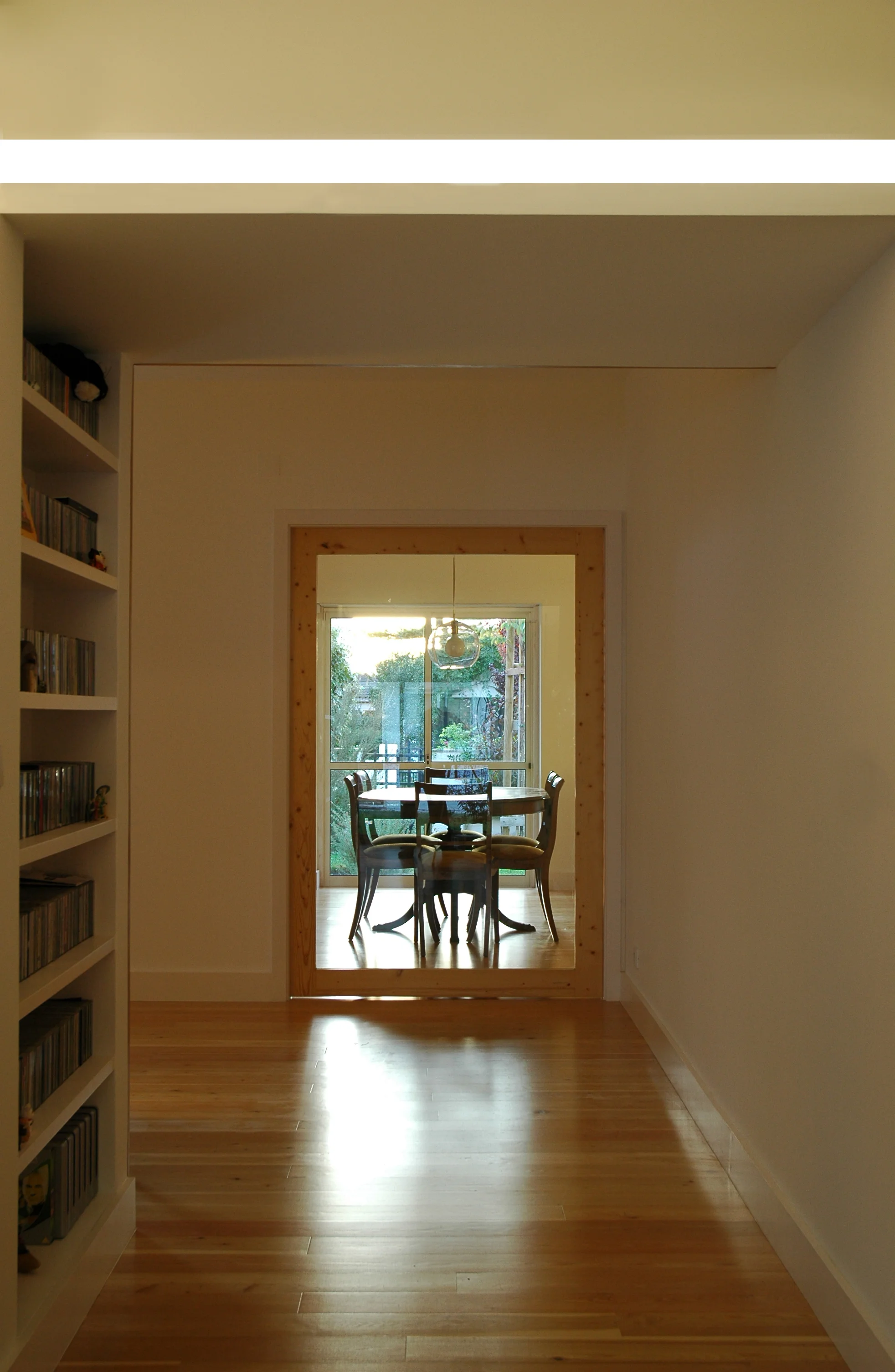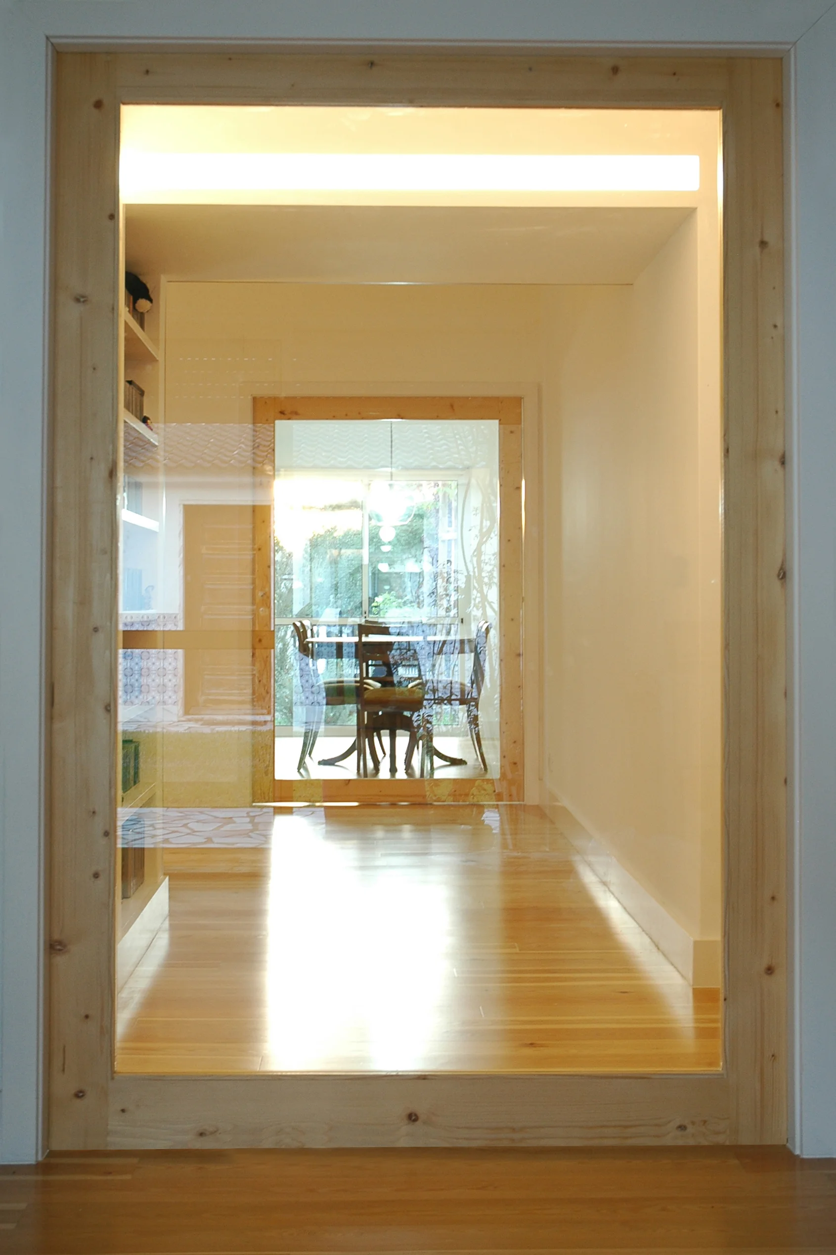 No piso térreo, os espaços verdes exteriores, a nascente e a poente, são levados para dentro de casa quando rompemos também horizontalmente o espaço e estabelecem de novo trajectos visuais. Fechamos os percursos com grandes portas de vidro emolduradas em madeira.