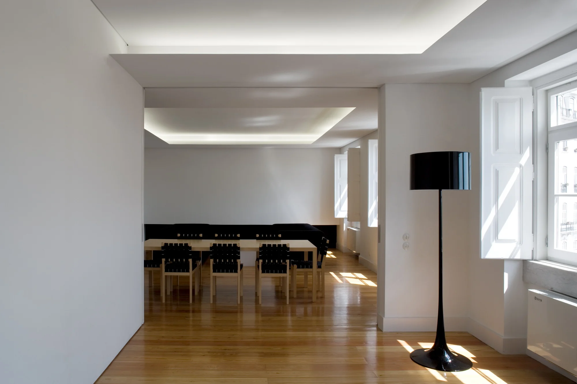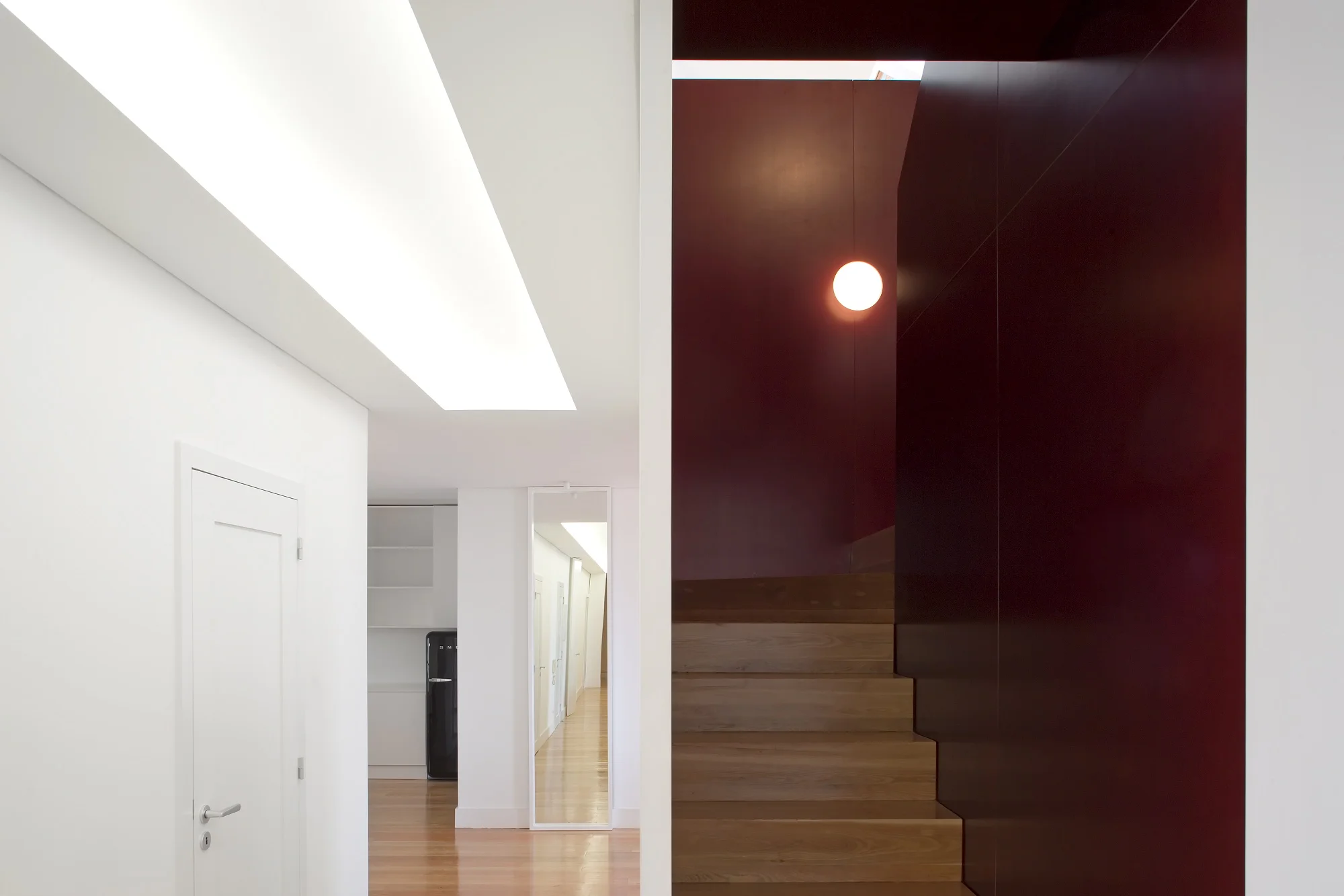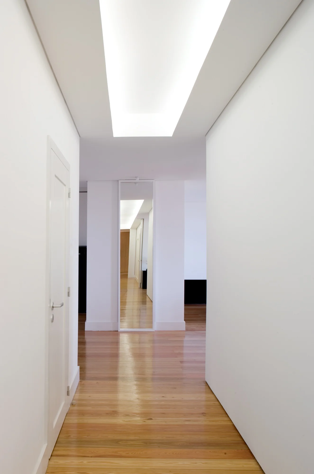 A escala da casa foi redefinida pela introdução de duas alturas no pé direito. Desenham-se sancas que contêm iluminação indirecta, centralizam os dois espaços das salas e acentuam a dinâmica do percurso no corredor. A imagem é a da leveza de uma folha de papel contrariando o peso dos tectos da casa (numa área de 260m2, um pé direito contínuo de 2,85 pareceu-me desajustado), além disso o tecto mais alto parece sempre revelar mais para lá do que é visível, pretende-se o céu…