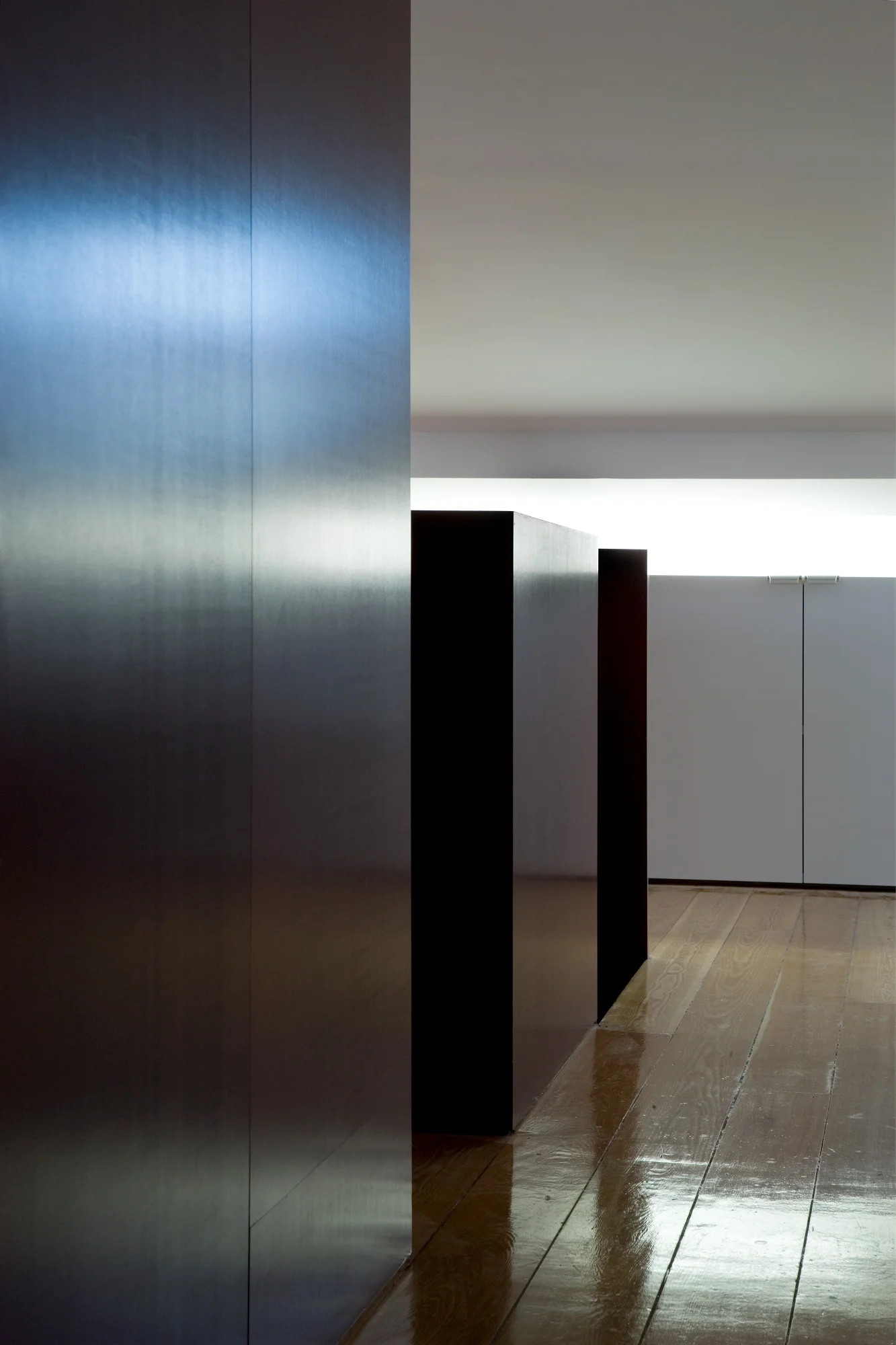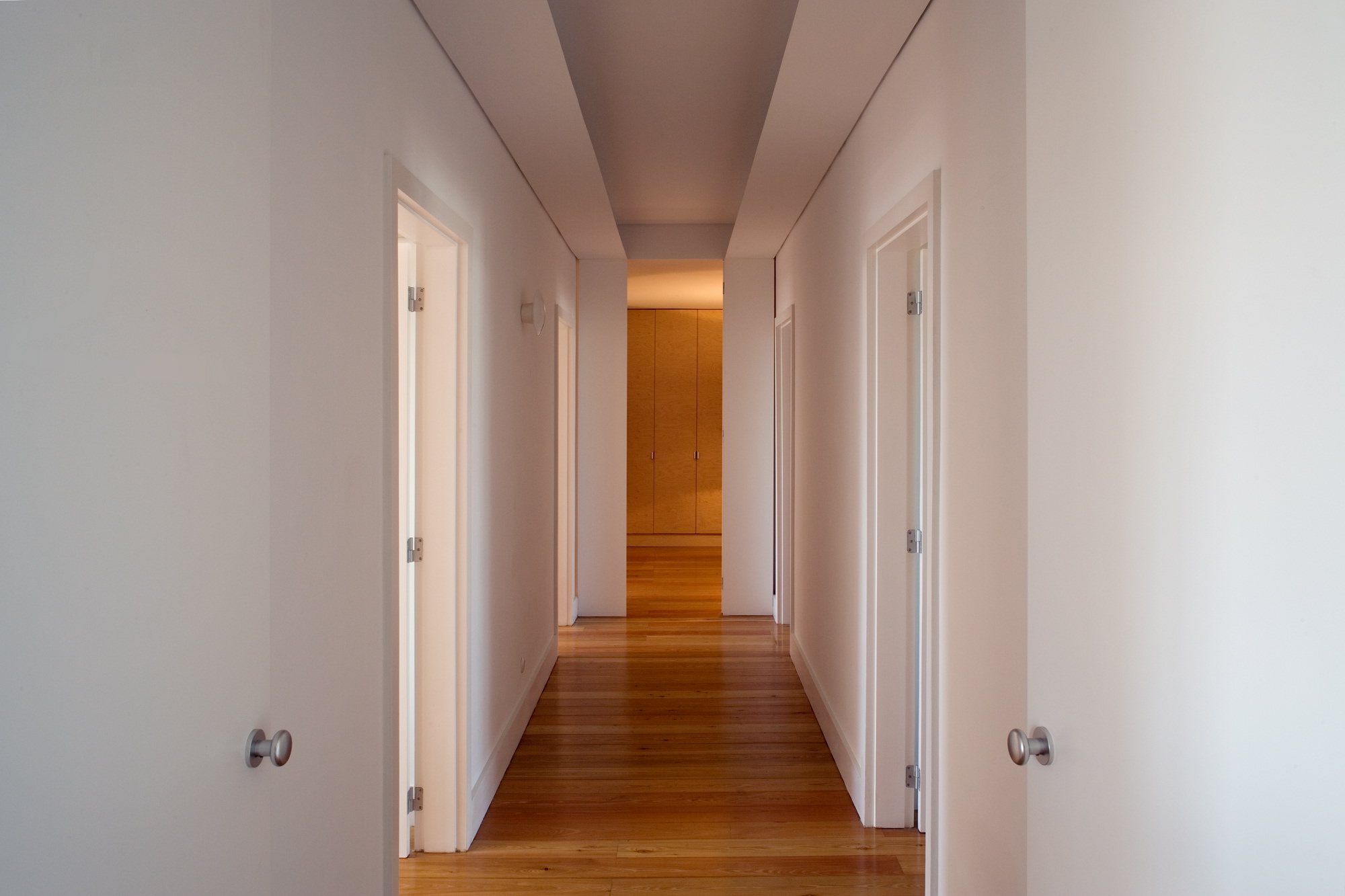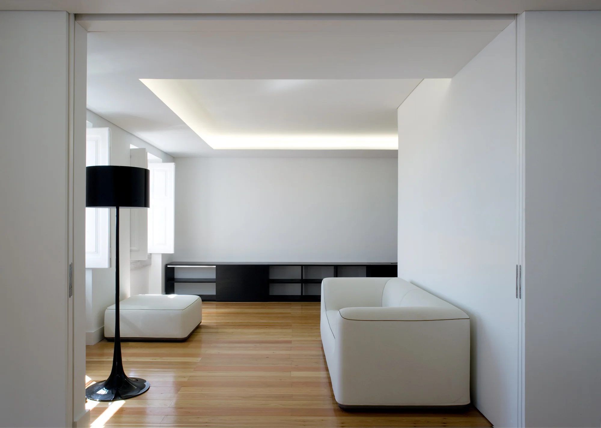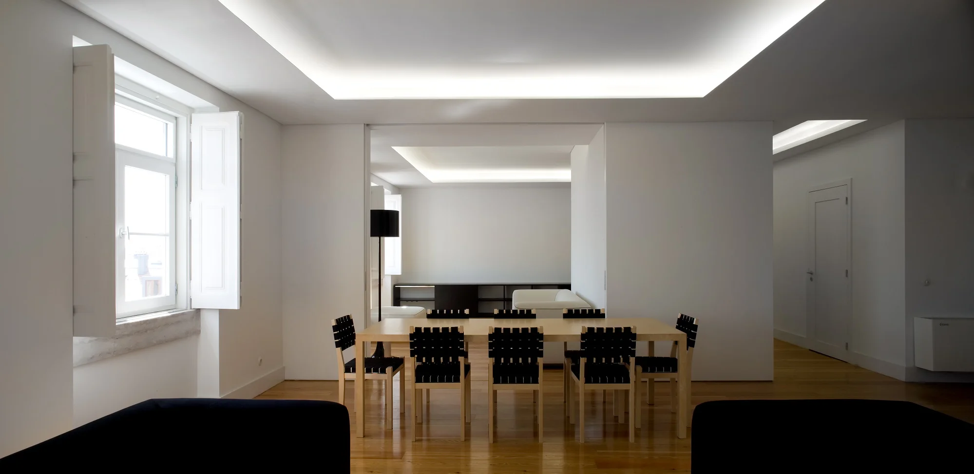 A escala da casa foi redefinida pela introdução de duas alturas no pé direito. Desenham-se sancas que contêm iluminação indirecta, centralizam os dois espaços das salas e acentuam a dinâmica do percurso no corredor. A imagem é a da leveza de uma folha de papel contrariando o peso dos tectos da casa (numa área de 260m2, um pé direito contínuo de 2,85 pareceu-me desajustado), além disso o tecto mais alto parece sempre revelar mais para lá do que é visível, pretende-se o céu…