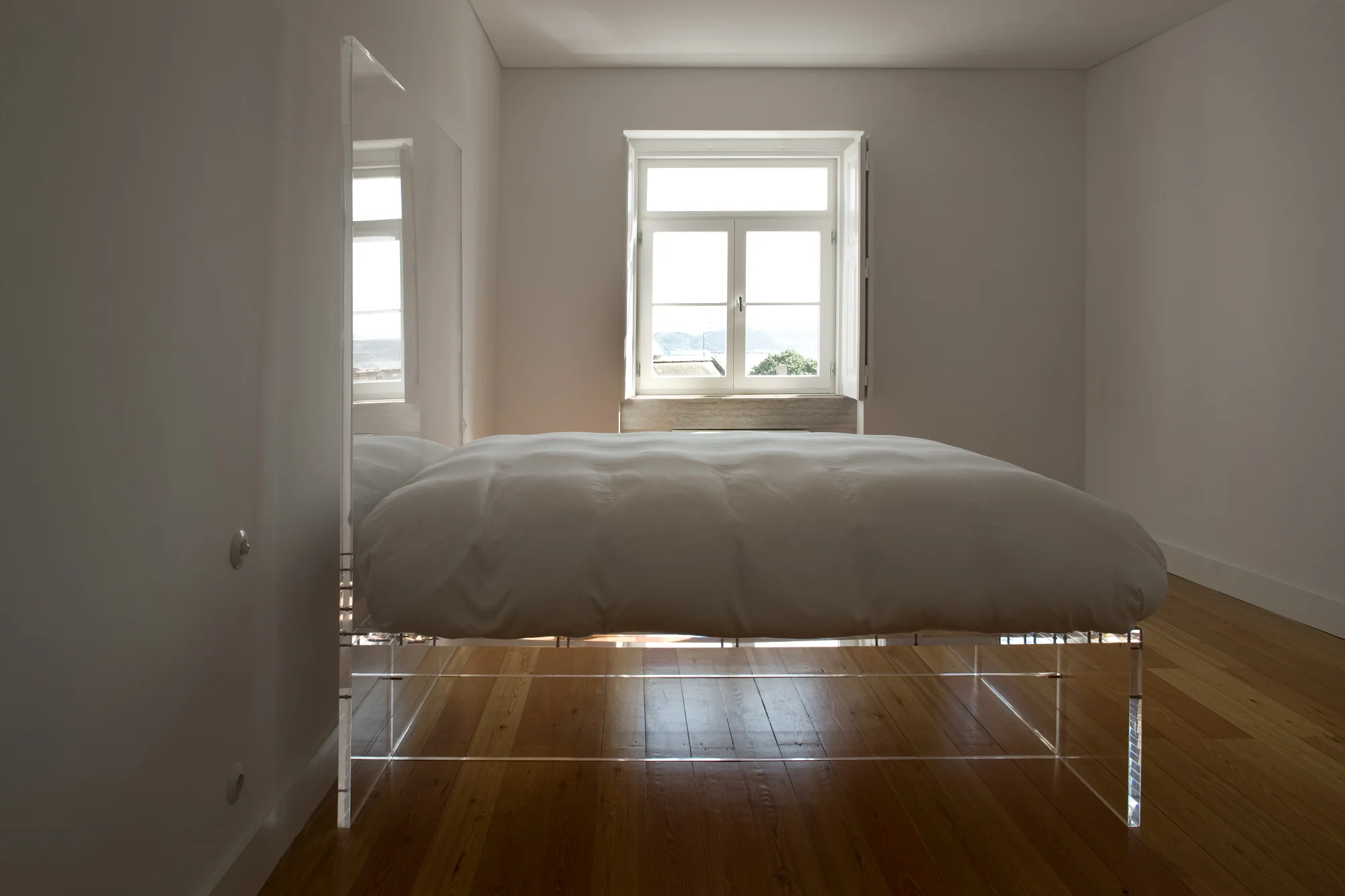 A salientar a cama do quarto principal construída em acrílico, um transparente absoluto, como uma nuvem, flutua…