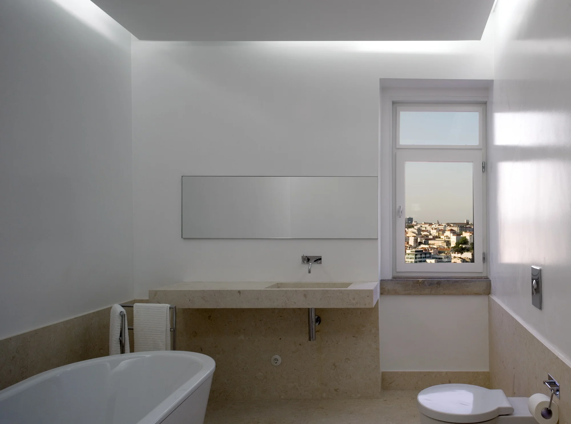 A imagem dos pés direitos altos e daquelas salas amplas de portas rasgadas que caracterizam a primeira construção não deixou marcas neste apartamento, situado na máxima altimetria de uma das sete colinas da cidade, com vistas panorâmicas a norte e a sul.