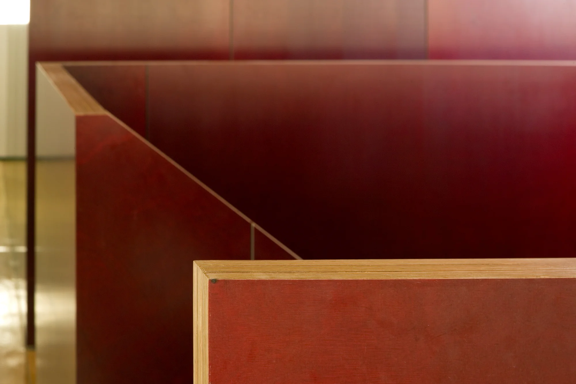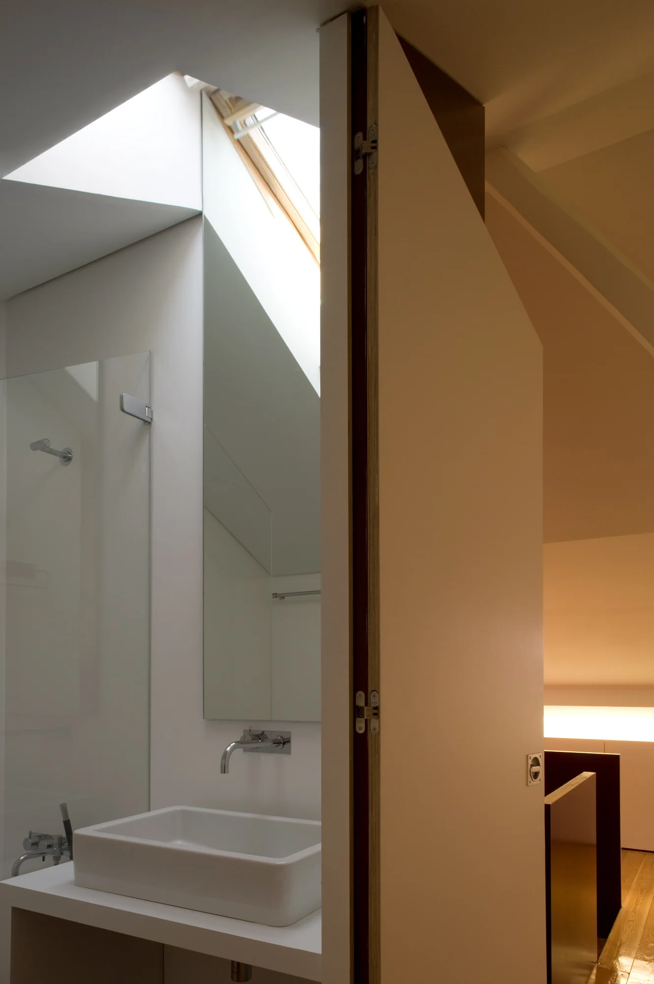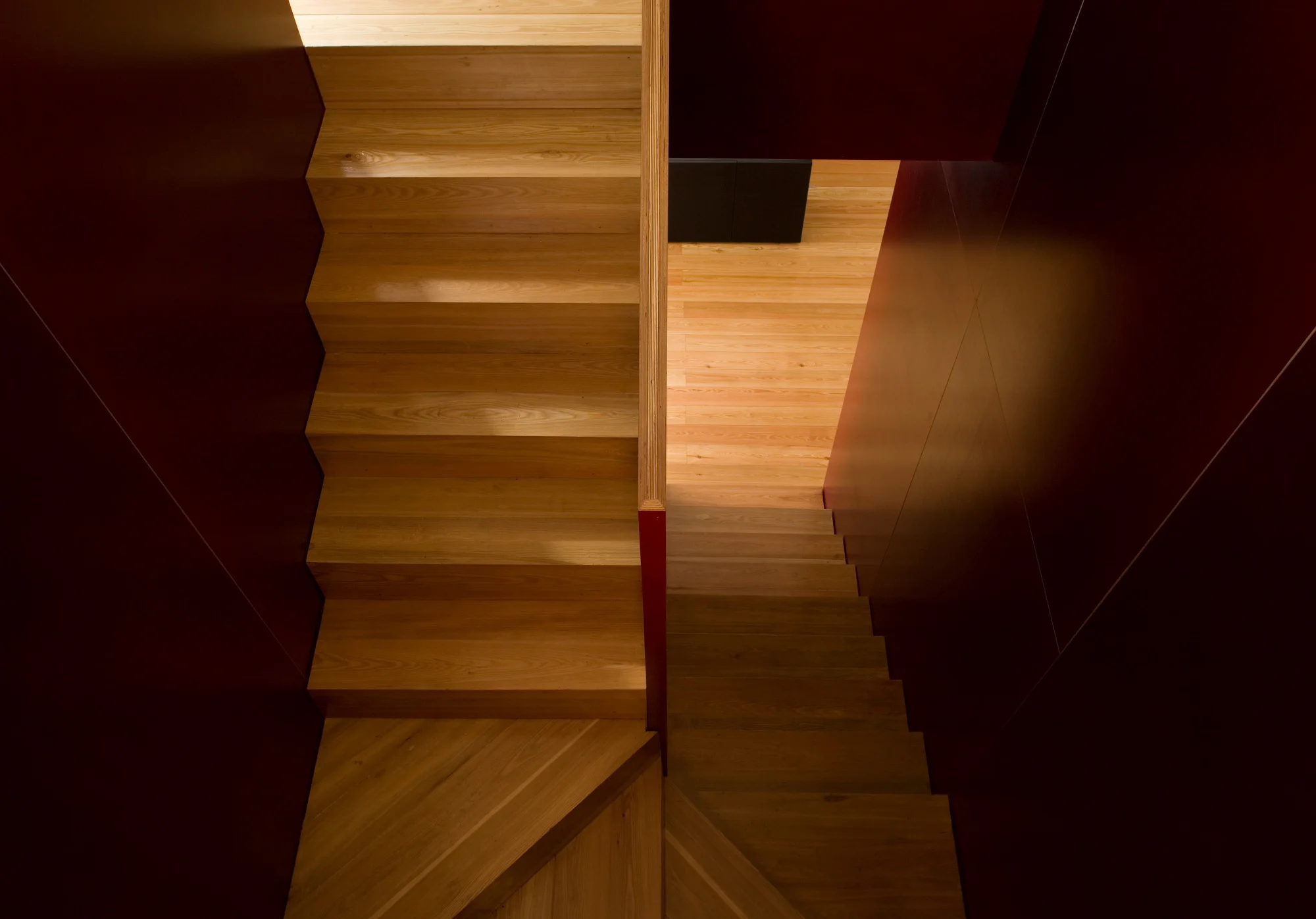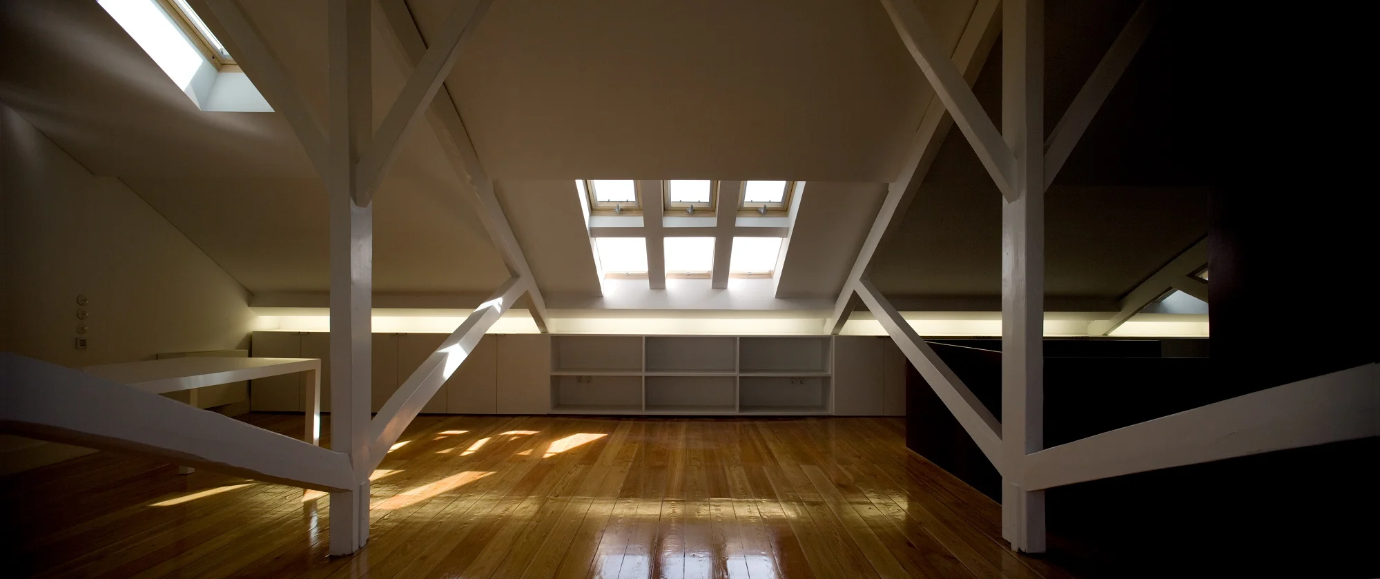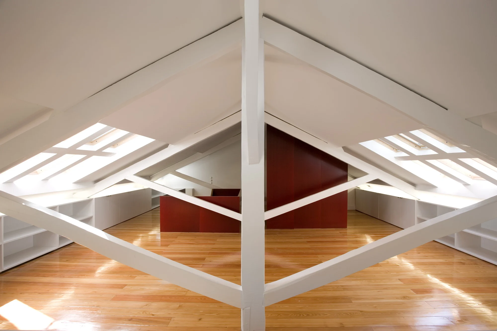Ao centro, o volume branco contem a escada de acesso ao sótão. Subimos entre paredes côr carmim até emergirmos à superfície com o sol a entrar pelos vários orifícios da cobertura. Este atelier de uma videasta é coberto por uma estrutura de asnas e tectos brancos. Como excepção, um volume carmim pelo exterior e branco no interior contém o lavabo.