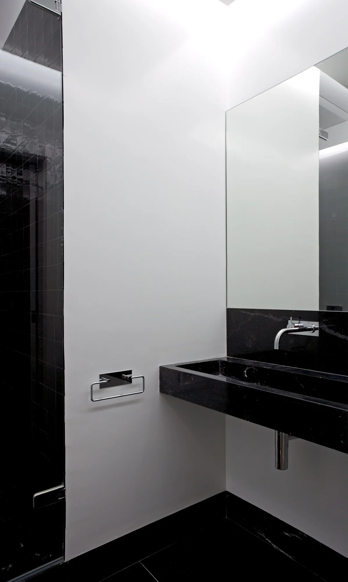 Esta vontade de leveza está também no plano de parede que constrói a lareira. Pinta-se uma faixa de preto em negativo para criar suspensão, e transpõe-se o positivo em forma de um aparador preto com fundo branco para a parede oposta, que limita a outra sala. Assim como forma de estabelecer uma relação visual entre estes dois espaços, unificando-os.