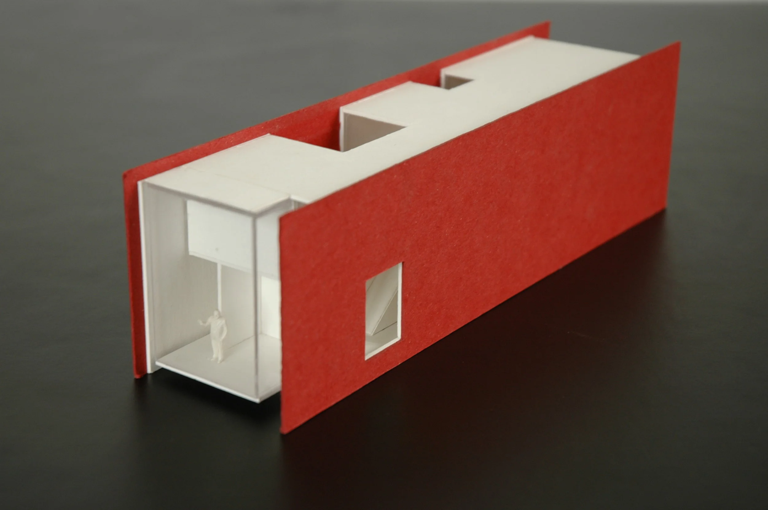 No alçado virado à rua, enterrados no prado verde, evidenciam-se os muros vermelhos – entre os quais um plano de vidro, que corresponde aos dois pisos, oculta a casa enquanto conteúdo e contribui para a acentuação do carácter autónomo dos muros.