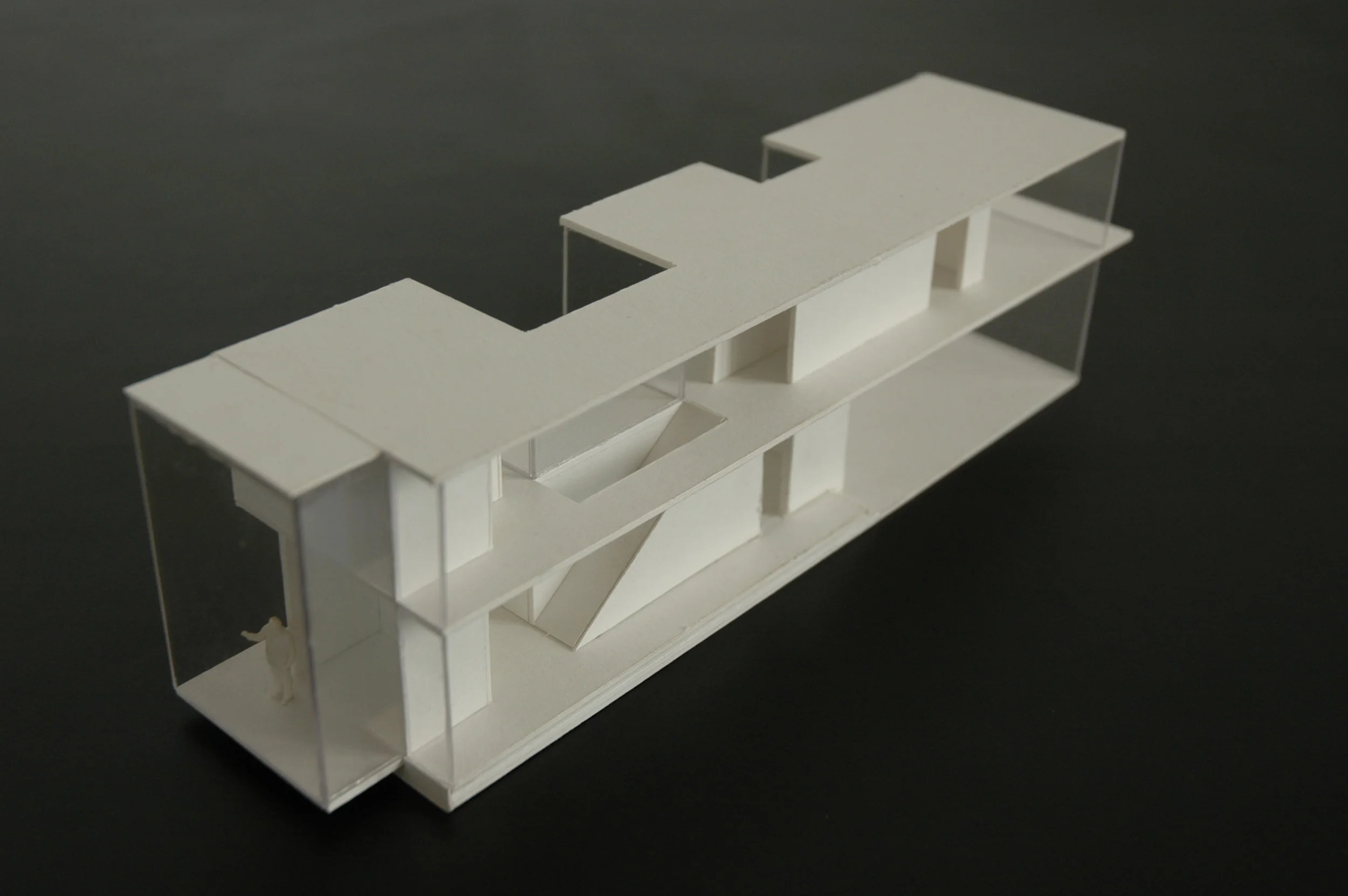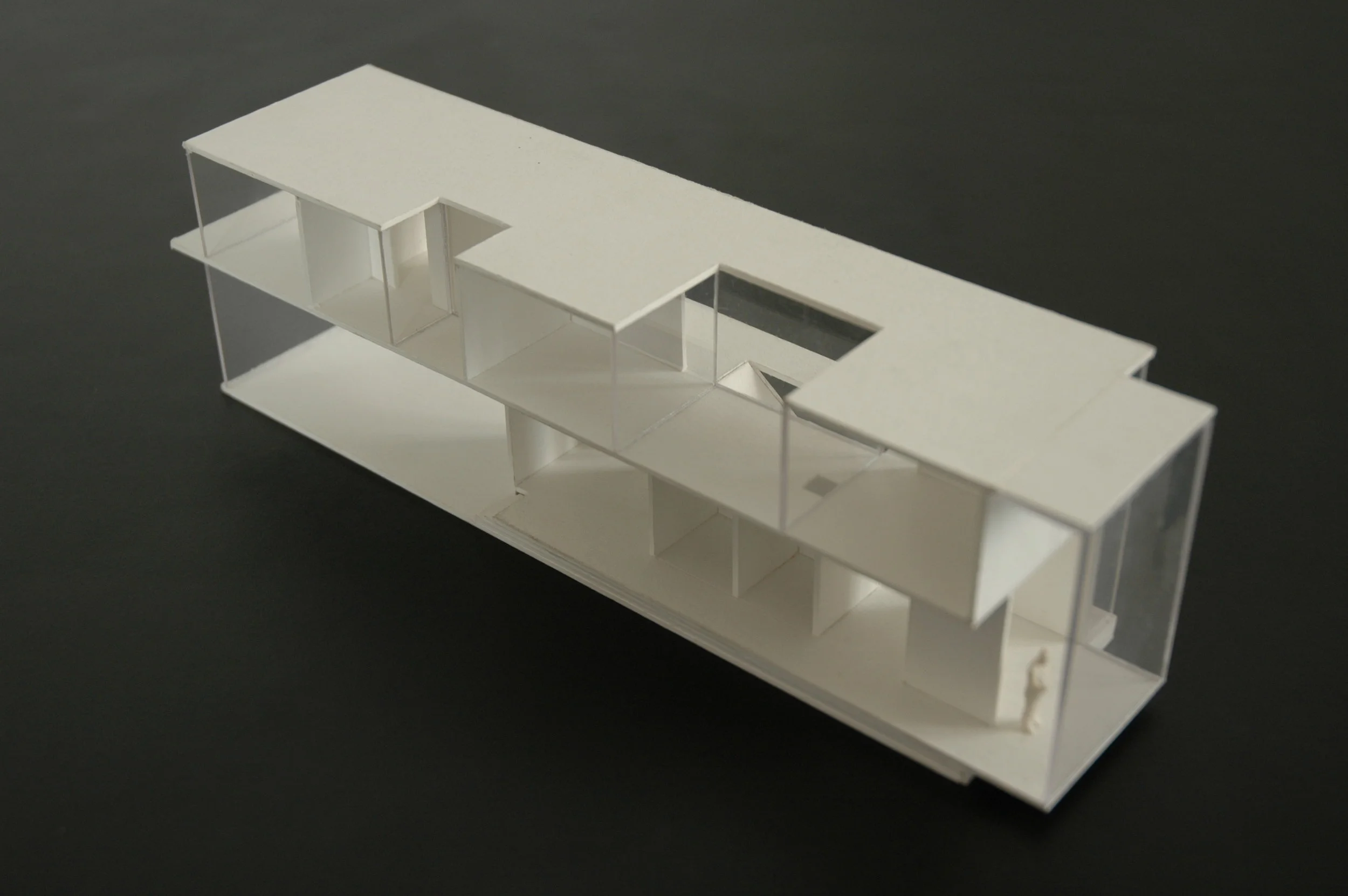 Com base nas condicionantes desta configuração, optou-se por traduzir o sentido de longitudinalidade do terreno na casa.
