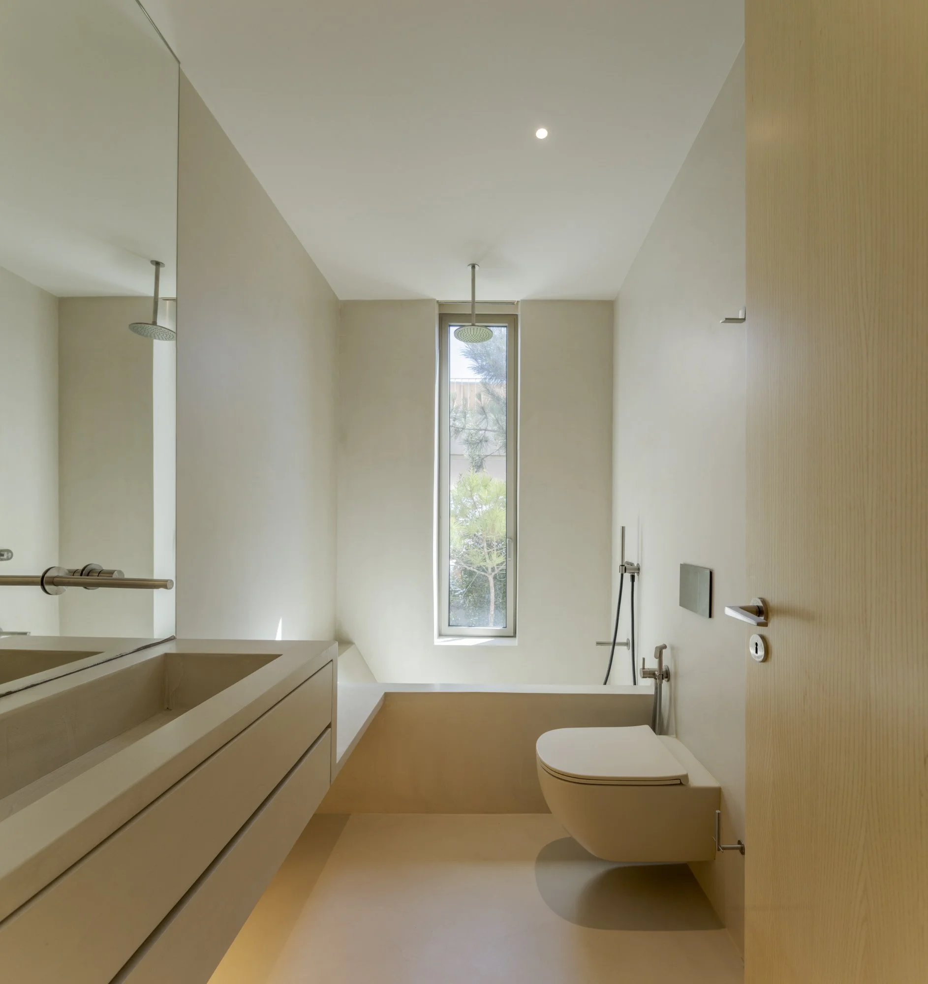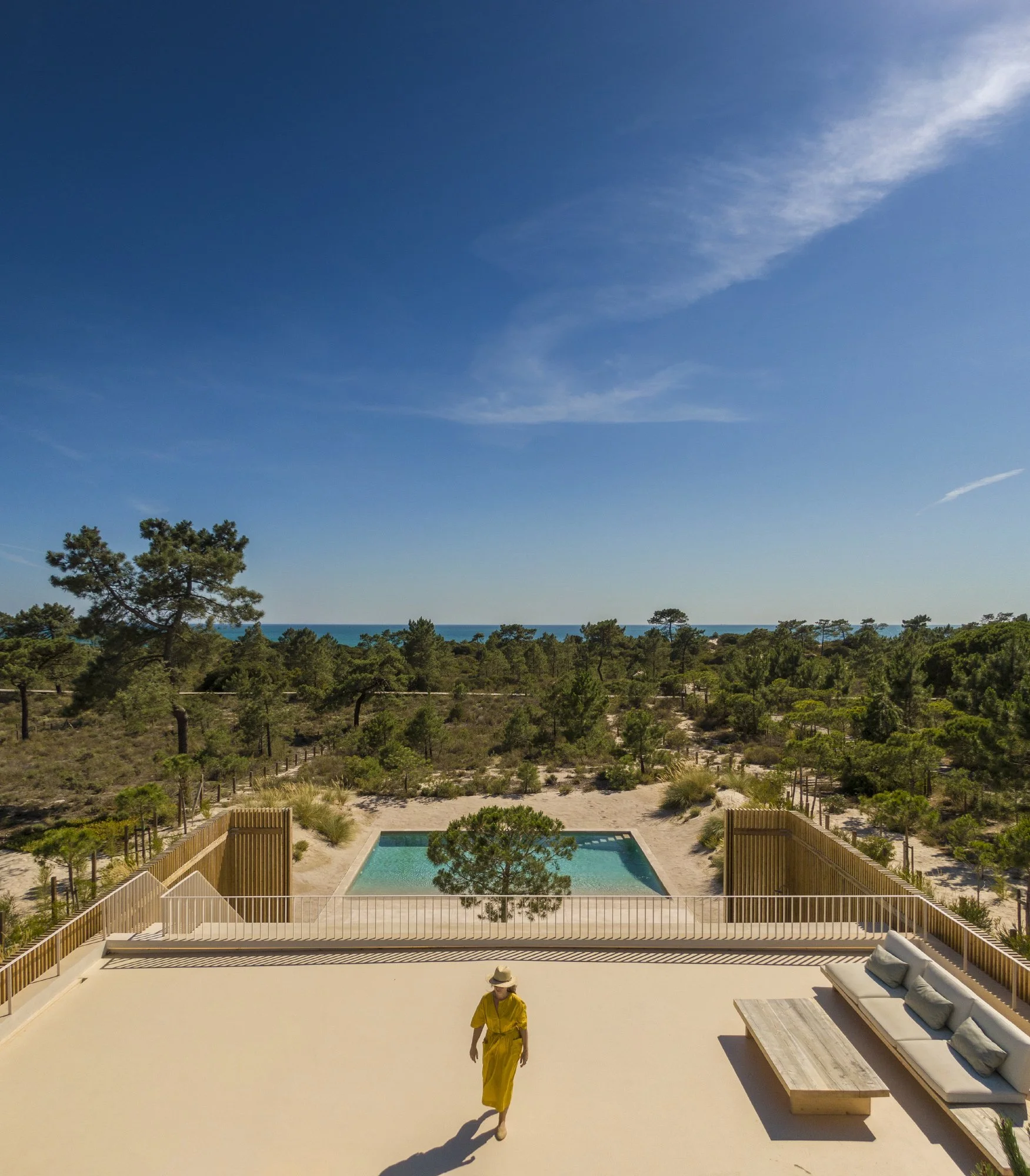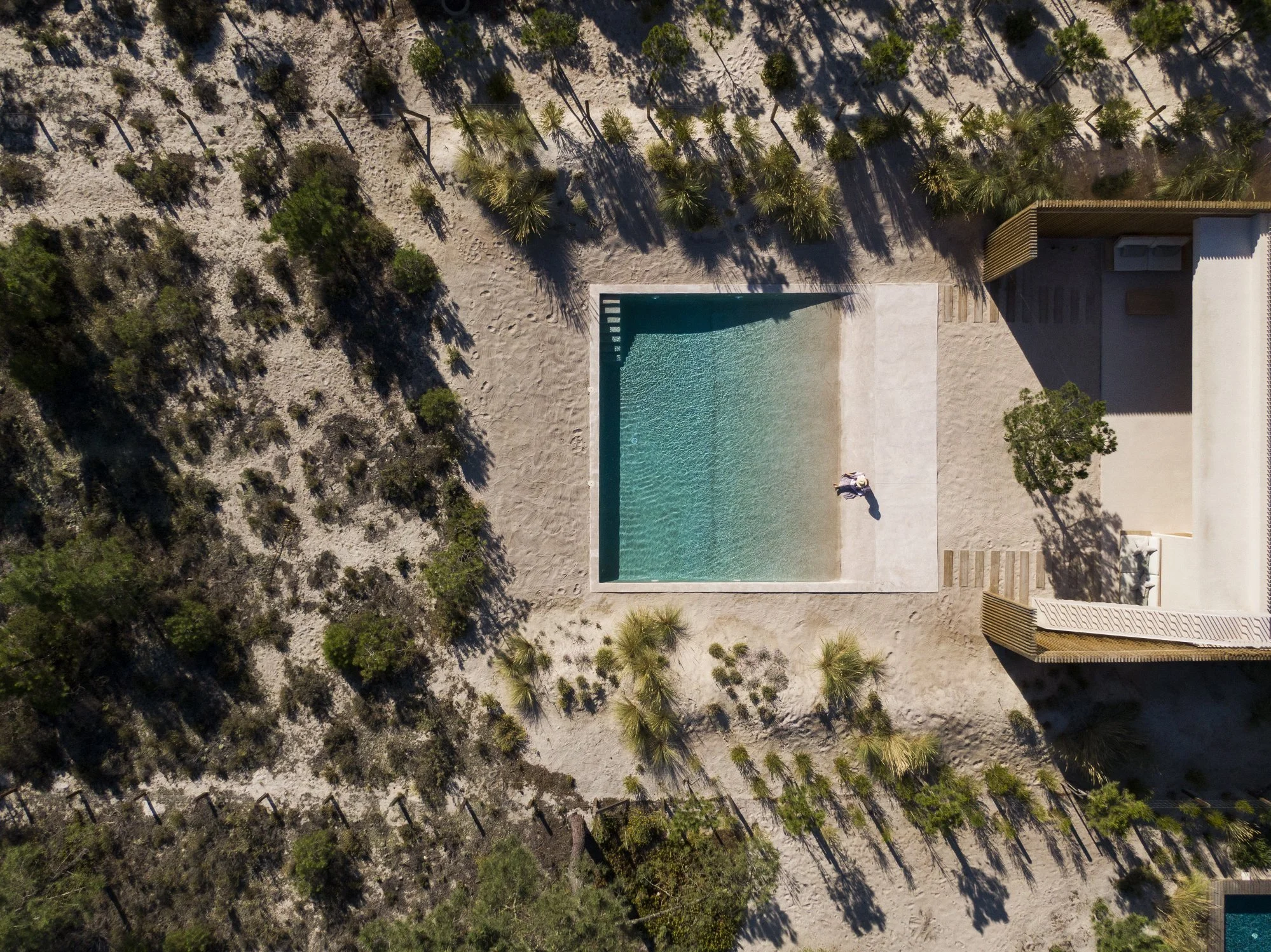 The pool's design anticipates the sea – a few meters ahead – and its access is given through a ramp covered by a sand-based mortar – establishing continuity with the dunes. The leisure area extends to the roof terrace, where the sea is visible.