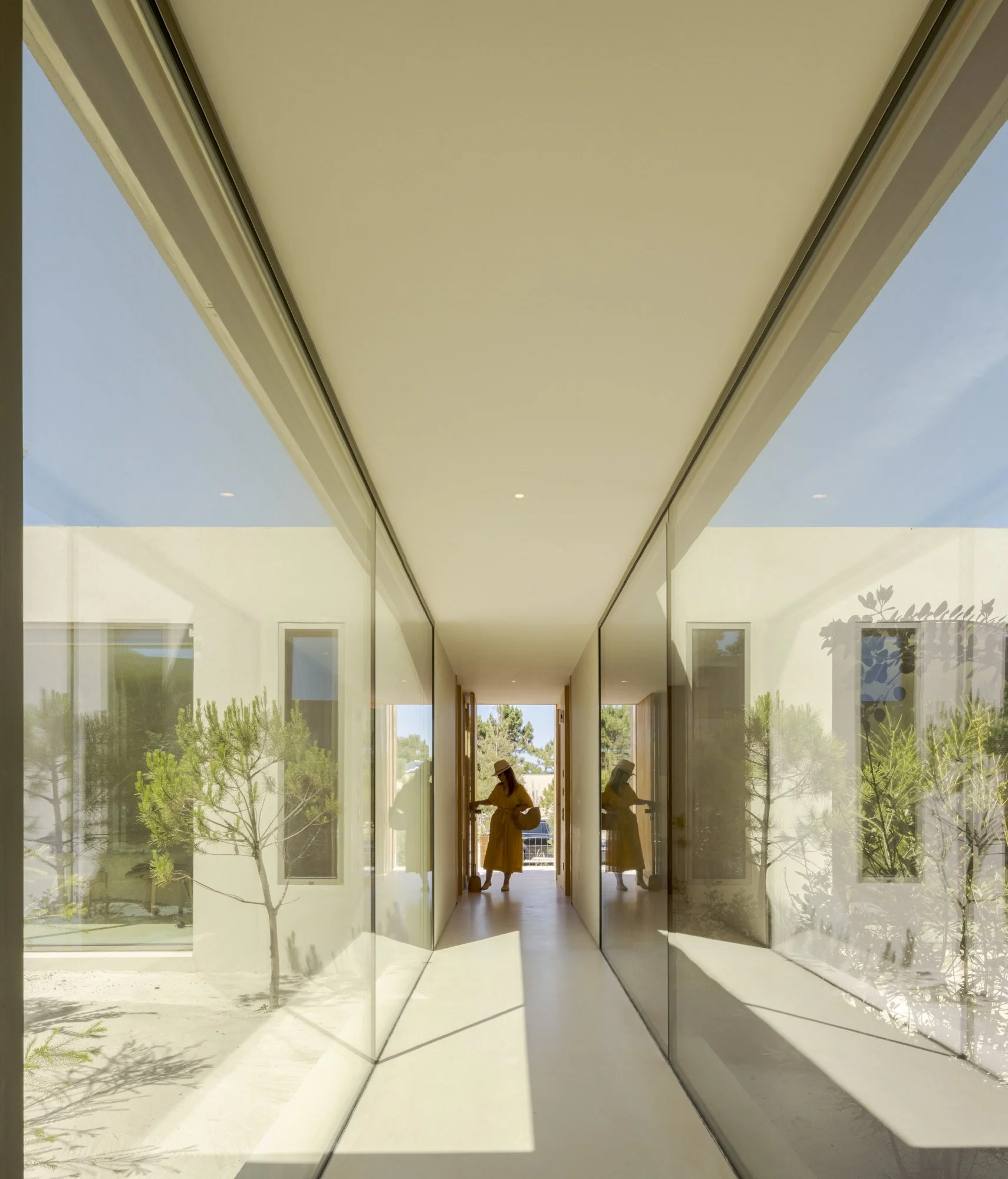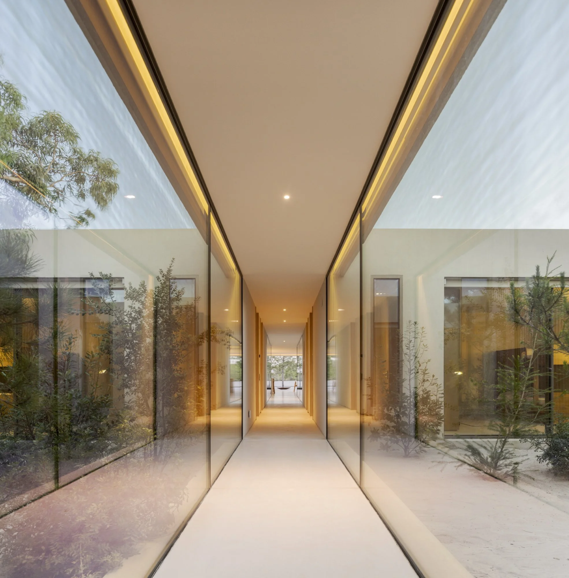 Inside, along a central and lengthy corridor, the house's private spaces are symmetrically located and interspersed with courtyards – in which the previously existing plant, such as pines, eucalyptus, and shrubs, have been kept. At the end of this corridor is the house's social area, which privileges the relationship with the landscape and is open to the exterior in a part of the terrain where the neighboring constructions are no longer visible.