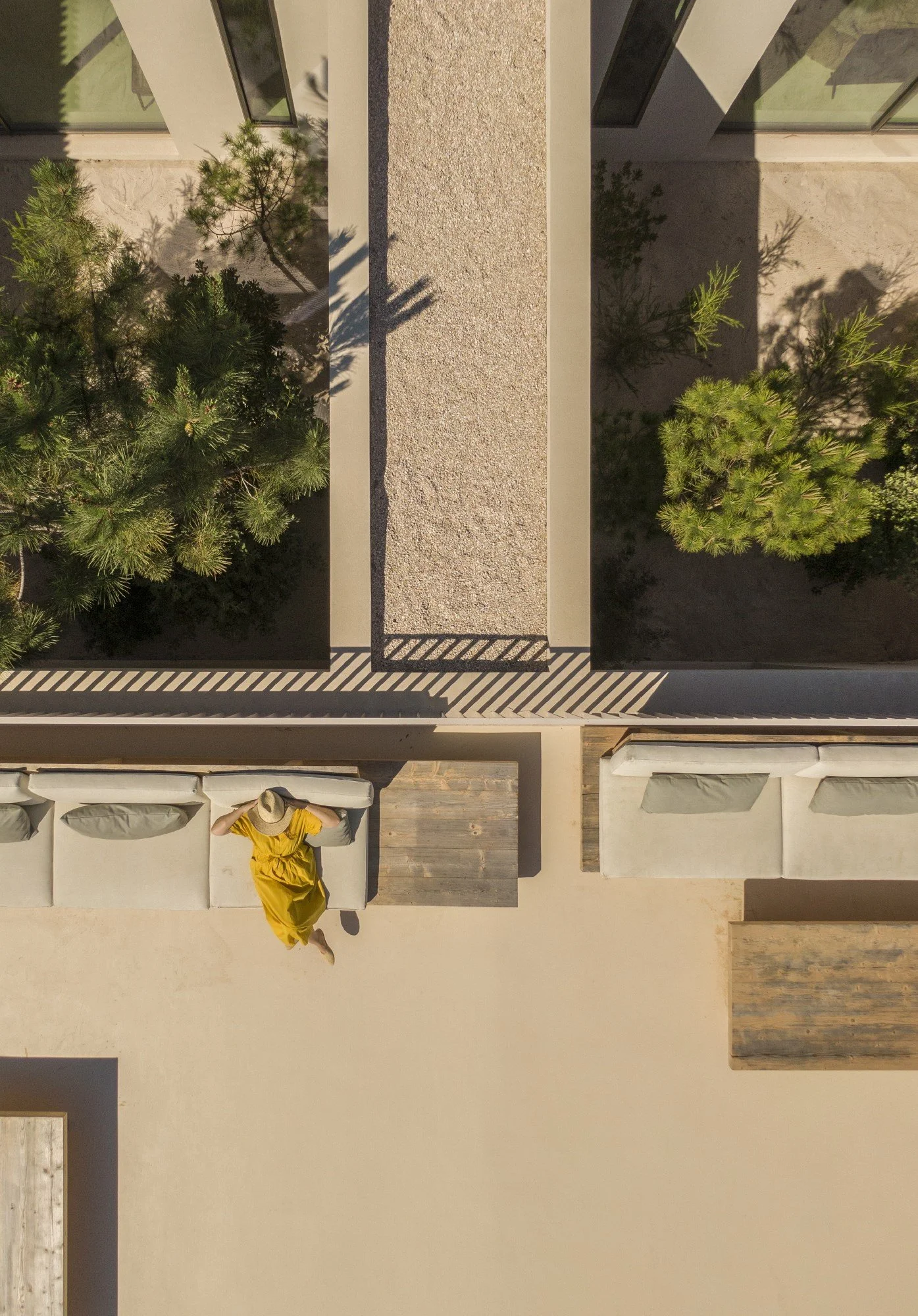 Por ser a pedra que mais se assemelha às camadas de areia, o travertino foi incluído na paleta de materiais de revestimentos, ao mesmo tempo que as madeiras de abeto e de freixo foram escolhidas para o mobiliário exterior e interior, respectivamente, contribuindo desse modo para definição de um todo que dá continuidade ao lugar.
