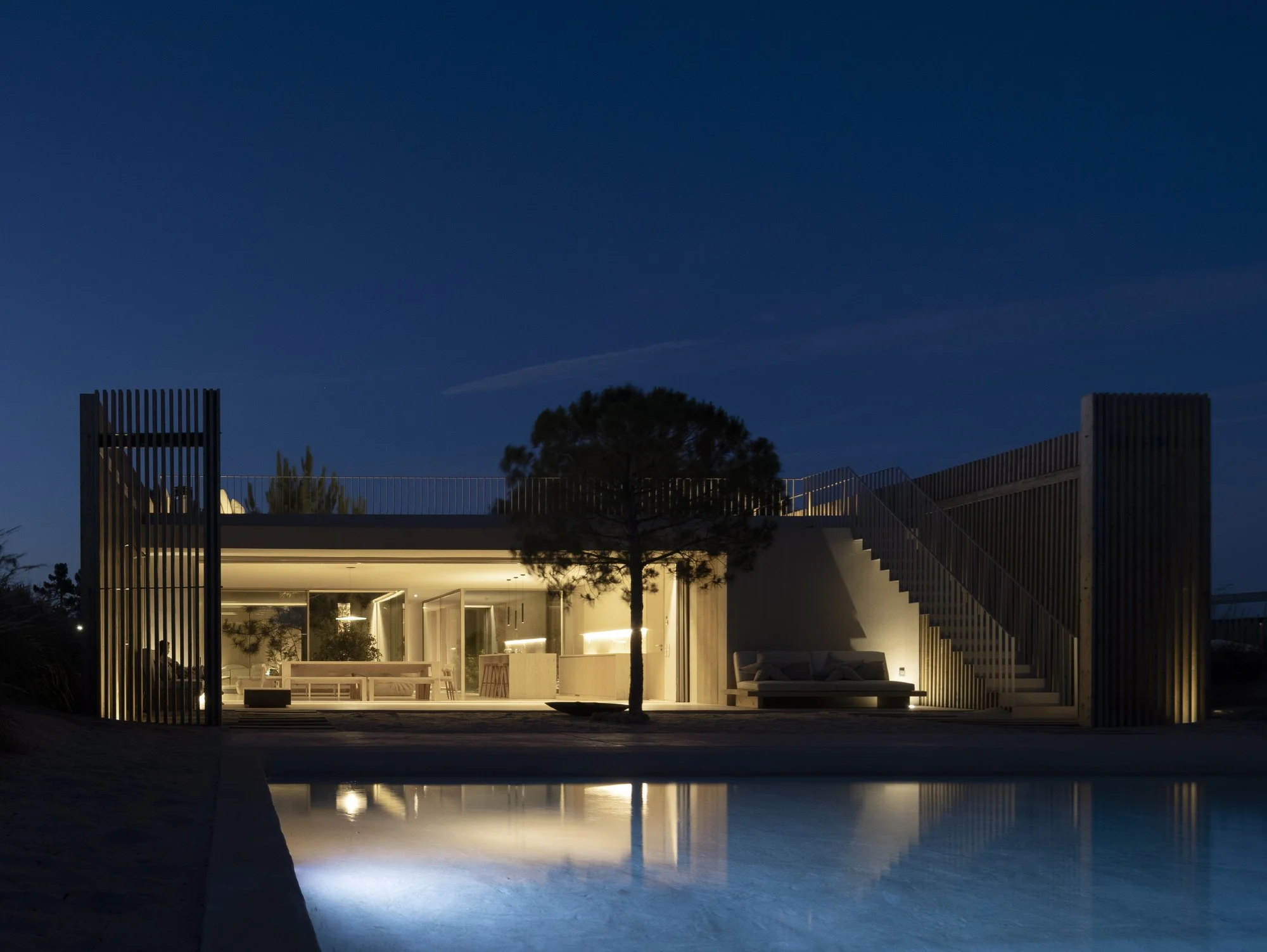 Como uma membrana entre o exterior e o interior, a paliçada contém, e oculta subtilmente, os diversos volumes que constituem a casa. Estruturados ao longo de um extenso corredor central, os espaços privados da habitação dispõem-se de forma simétrica e são intercalados por pátios – nos quais foram mantidas espécies vegetais, como pinheiros, eucaliptos e arbustos. No final do percurso configurado pelo corredor, encontra-se o espaço social da casa, que privilegia a relação com a paisagem, abrindo-se ao exterior e à área de lazer, numa parte do terreno onde já não são visíveis as restantes habitações.
