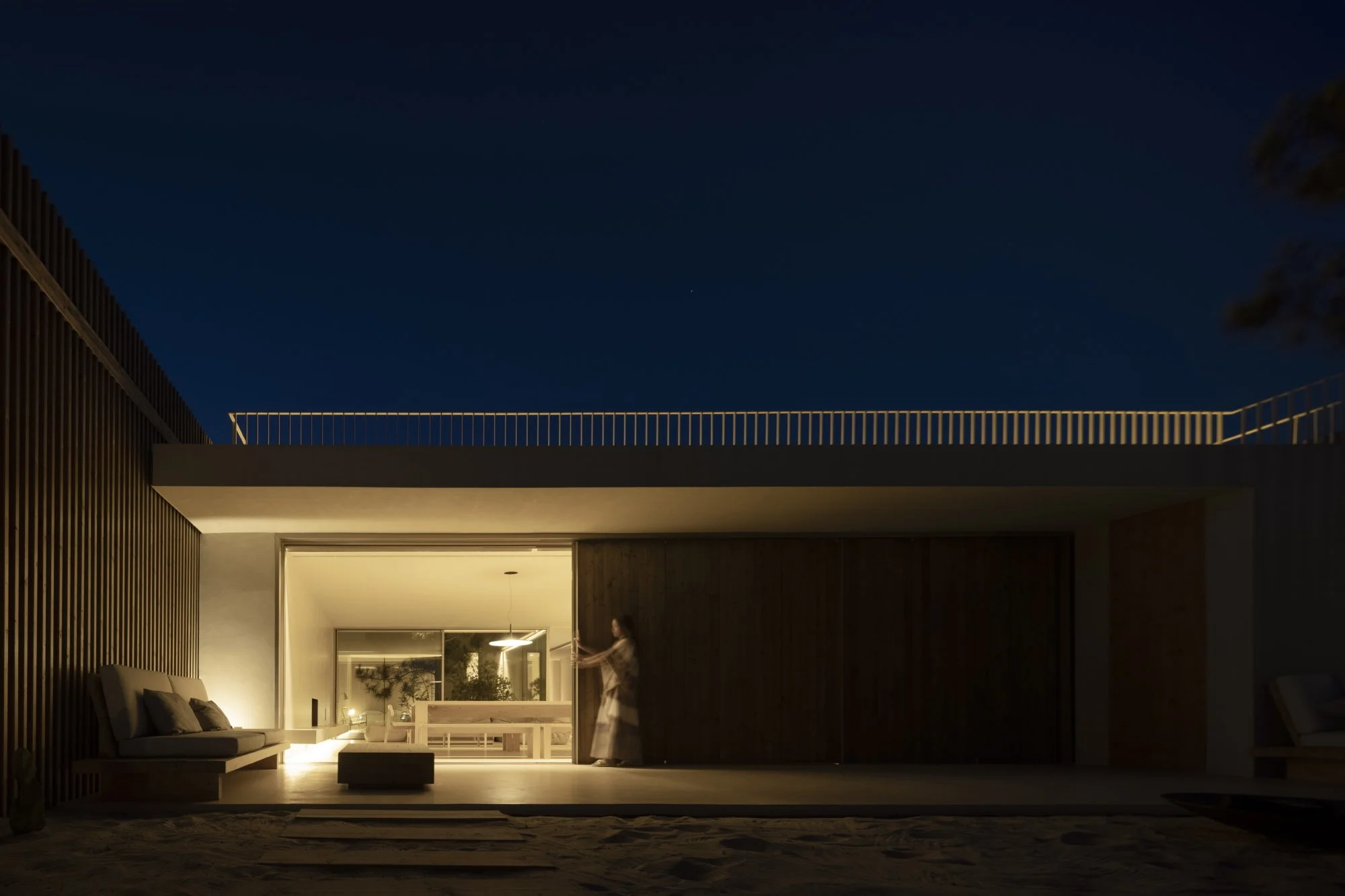 Complementarily, a long palisade in fir wood was erected to preserve the new dune, which defines the perimeter of the construction while subtly concealing the various volumes that the house comprises.