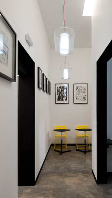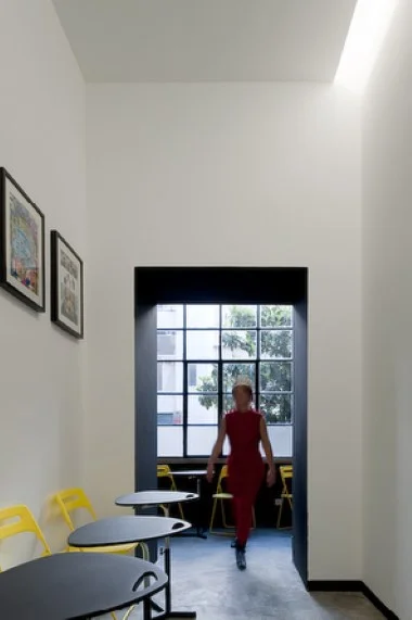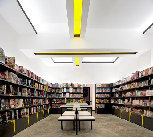 Uma sequência de espaços – Livraria/Galeria de exposição de originais – Salas de workshops – Gabinete – Cafeteria, são atravessados por um eixo visual que percorre todos os espaços até encontrar a imagem de uma nespereira através do grande envidraçado em ferro e vidro, que ocupa toda a fachada tardoz do espaço. Esta área foi totalmente pintada de preto para enfatizar toda a luz natural que entra através do extenso envidraçado.