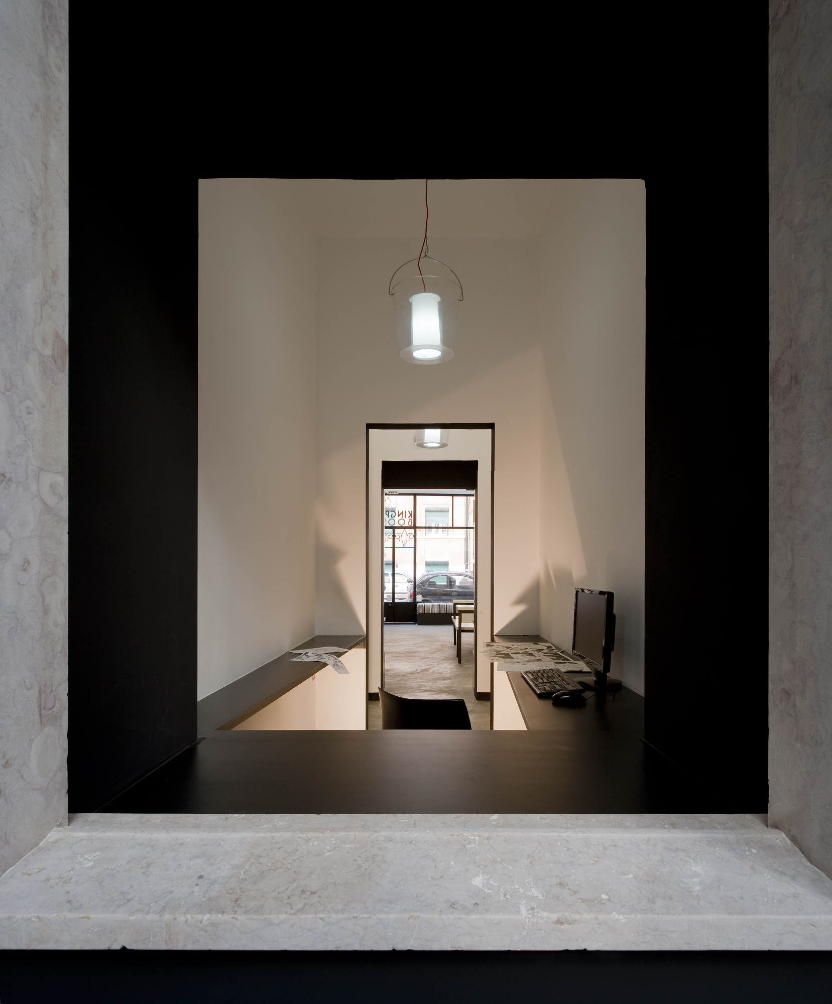 Ao centro do espaço uma peça de equipamento é balcão de atendimento e banco de apoio à leitura – uma instalação em aço e madeira lacada a preto e branco.